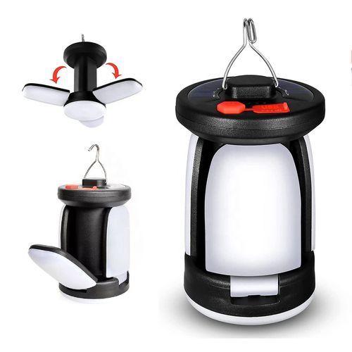 Solar-powered, foldable outdoor hanging light for camping and emergency charging.
